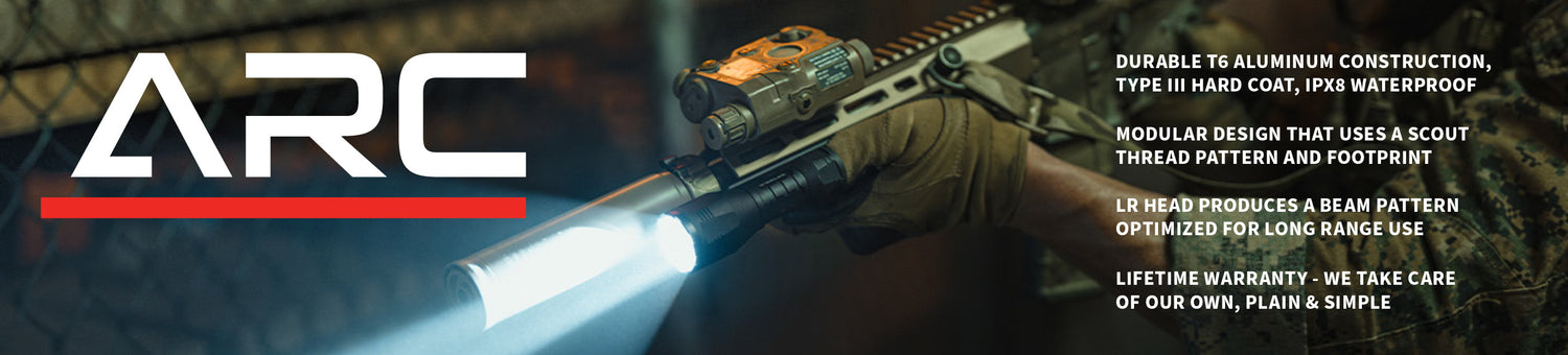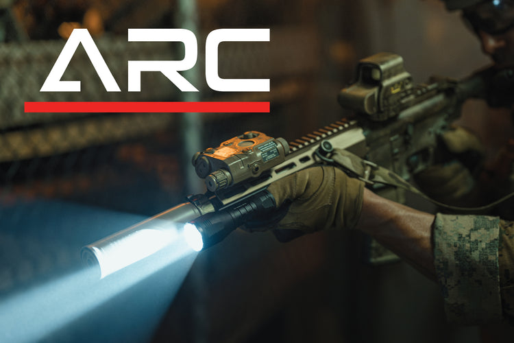 The ARC's integrated mounting lugs and the included M-LOK 45 Mount allow for an out-of-the-box solution, with additional scout-style options like the M-LOK Inline Mount and 1913 Offset Mount available separately. Powered by a rechargeable 18650 battery, it offers 2 hours and 45 minutes of continuous operation, while its Dual Fuel capability allows users to run CR123 batteries as a back-up. Constructed from 6061 T6 aluminum with a MIL-SPEC type III hard coat anodized finish, the ARC is IPX8 waterproof to 20 meters and meets MIL-STD-810H specifications, ensuring performance in the toughest environments.